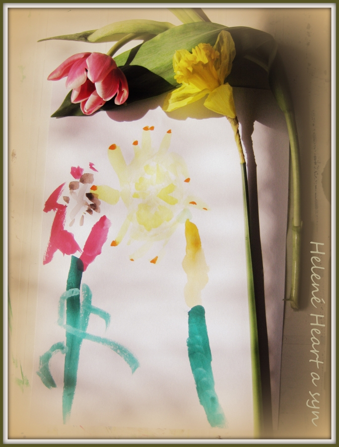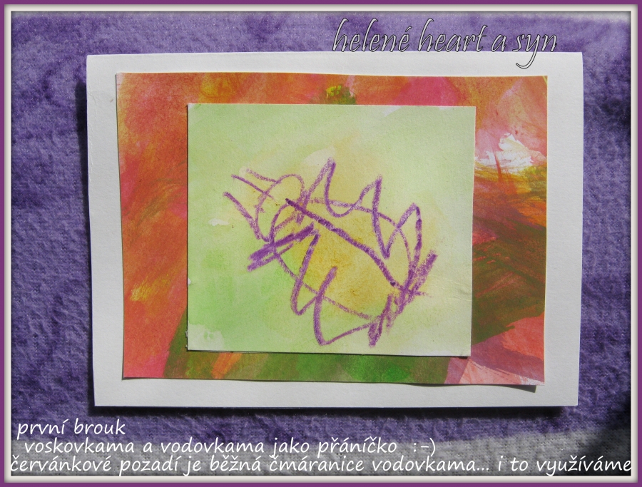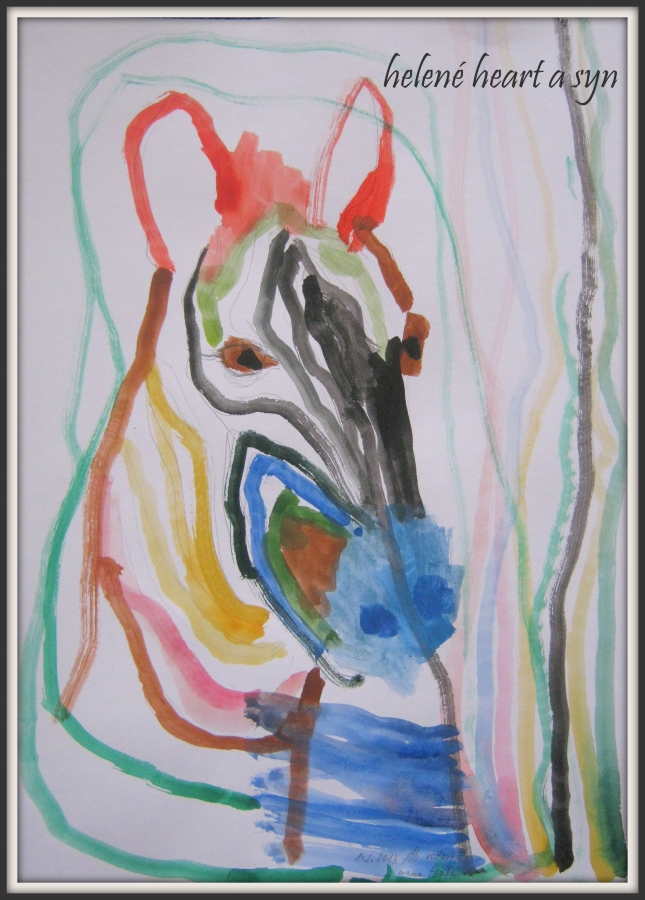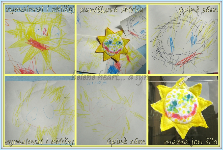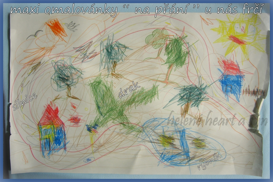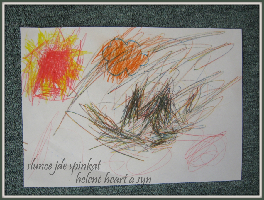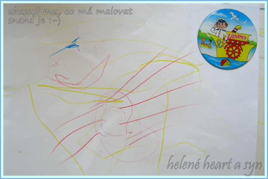Syn je hodně hrrr a poněkud hyper a udržet ho někde na židli je výkon, avšak tvoření mu dělá radost :-) dnes už dokáže sám namalovat pastelkama třeba sluníčko, tátu, auto...